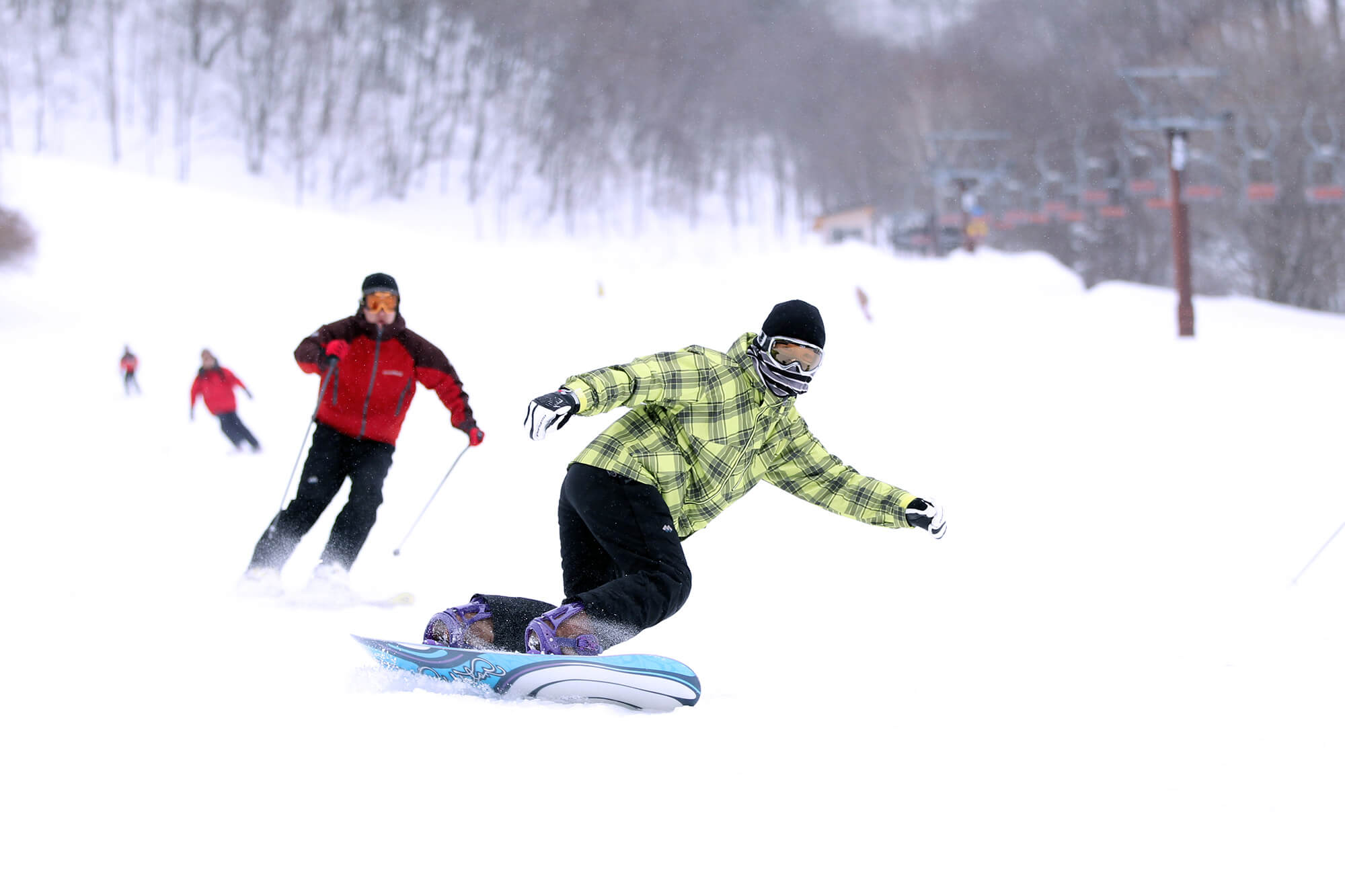 中級者には、白樺の林を抜ける約2,500mのロングクルージングが楽しめる「湯の平コース」が人気です。適度な斜度変化があり、レベルアップにも最適です。そして、腕自慢の上級者を待ち受けるのが、最大斜度38度を誇る難関「ジャイアントコース」。新雪が降った朝一番の、非圧雪パウダーライディングは格別の一言です。