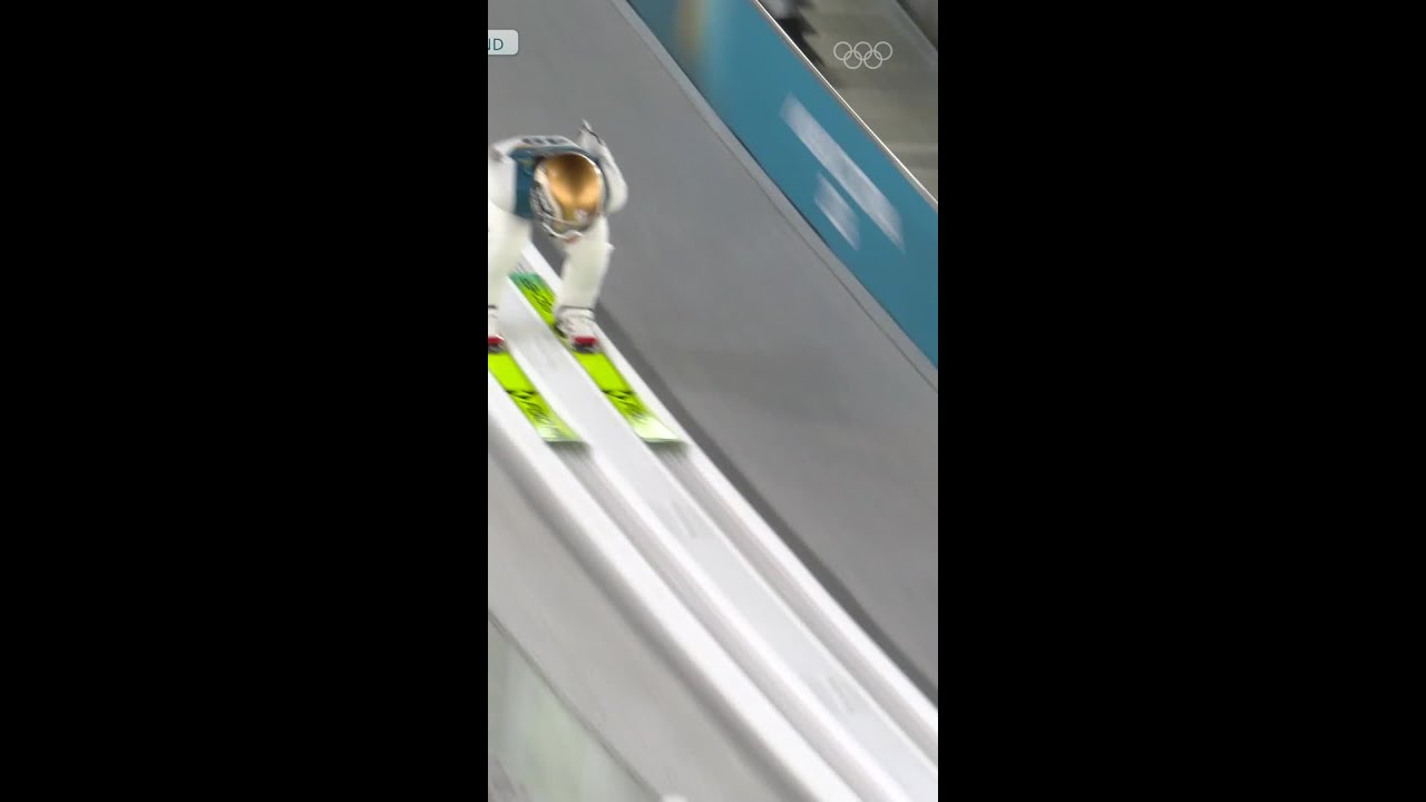 2本目、ゲートを離れた彼女は、アプローチで低い姿勢を保ち、サッツ(踏み切り)の瞬間に爆発的なパワーを解放。