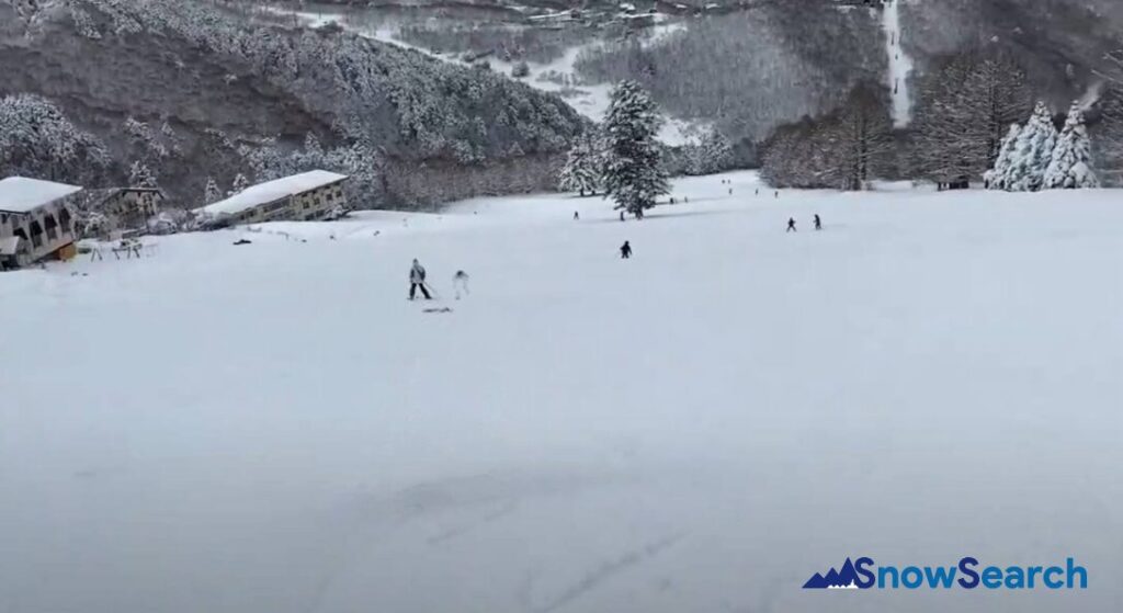 発哺ブナ平方面に出れば、平らで広いコースが現れます。コースの真ん中に木が立っているのが特徴で、正面にはジャイアントスキー場が見れます。