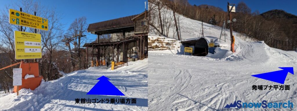 このゴンドラを降りて、更に東館山のゴンドラを乗り継いで頂上に行くルートと、ゴンドラを降りて発哺ブナ平の広いゲレンデを滑り降りてくるルートがあります。